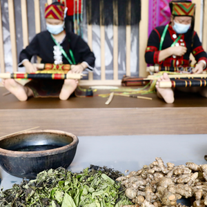 4月20日,在博鳌亚洲论坛主题公园内举办的“寻觅雨林·万物共生”热带雨林文化展上,黎族妇女使用纯天然染料染成的彩线织锦。新华社记者 张玉薇 摄