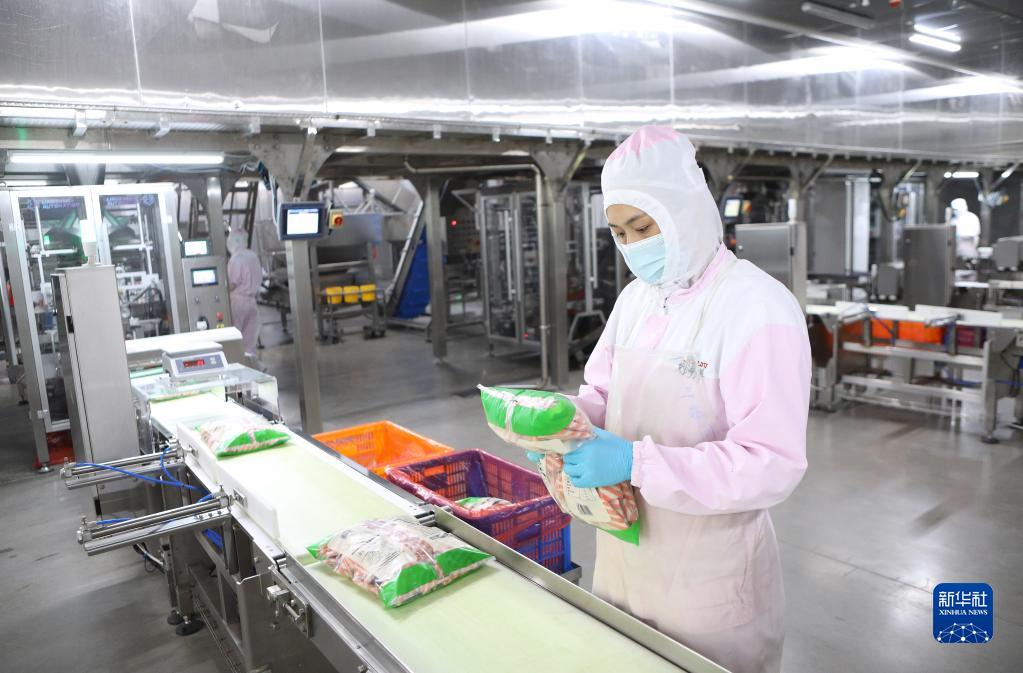 4月21日,工人在辽宁省台安县一家食品有限公司生产线上检查食品包装。