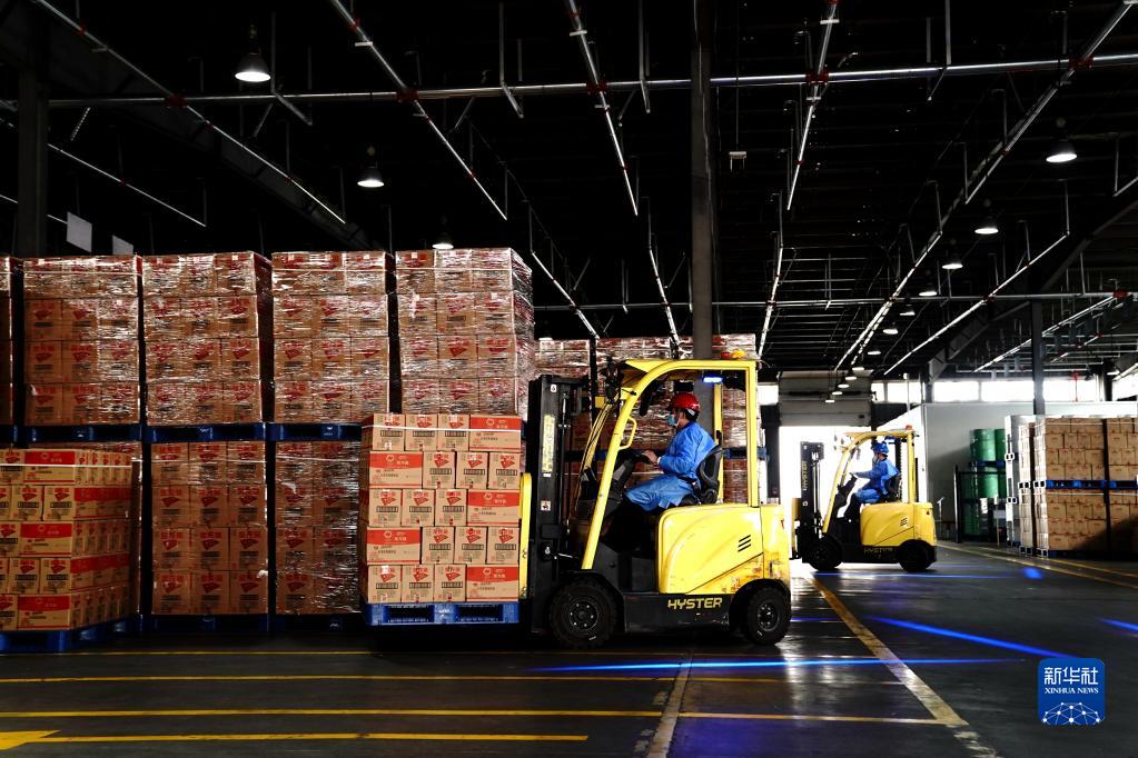 4月22日,在上海嘉里食品工业有限公司的仓库,叉车操作人员运输食用油产品。