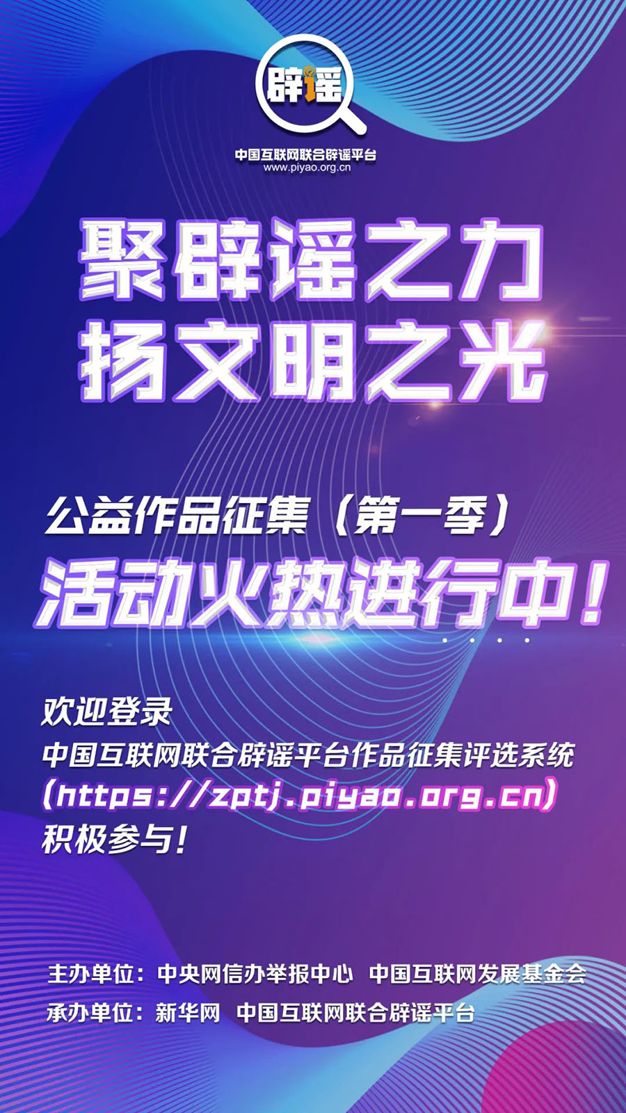 为汇“聚辟谣之力”,弘“扬文明之光”,提高全民辟谣的意识和唱响时代强音,推进网络谣言共治,营造清朗网络空间,中央网信办举报中心、中国互联网发展基金会于2022年1月20日至5月20日开展“聚辟谣之力 扬文明之光”公益作品征集(第一季)活动,向社会征集公益作品。