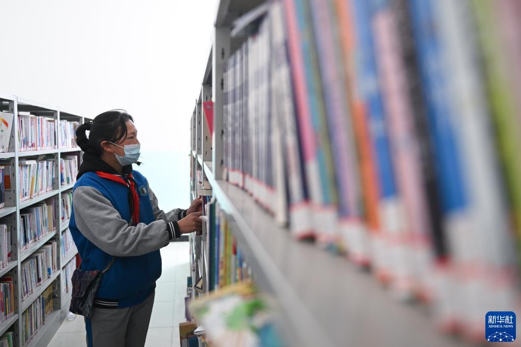 4月22日,青海省玉树藏族自治州曲麻莱县巴干乡寄宿制小学的学生在图书室借阅图书。