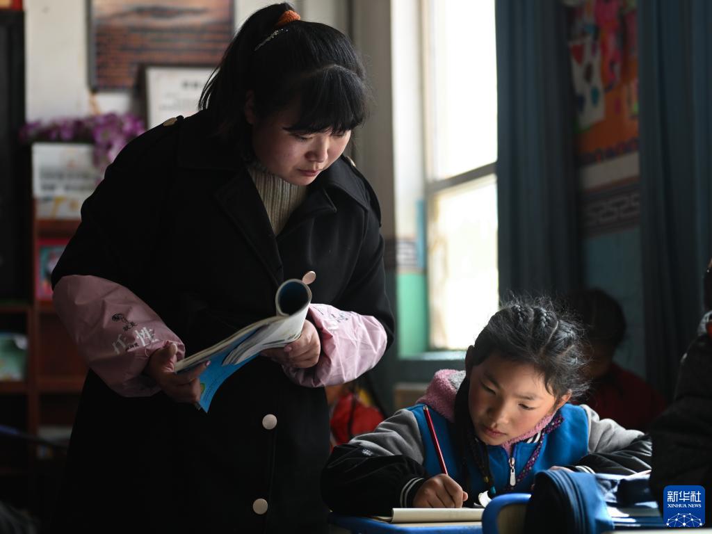 4月22日,青海省玉树藏族自治州曲麻莱县巴干乡寄宿制小学的教师王芳(左)在指导学生学习。