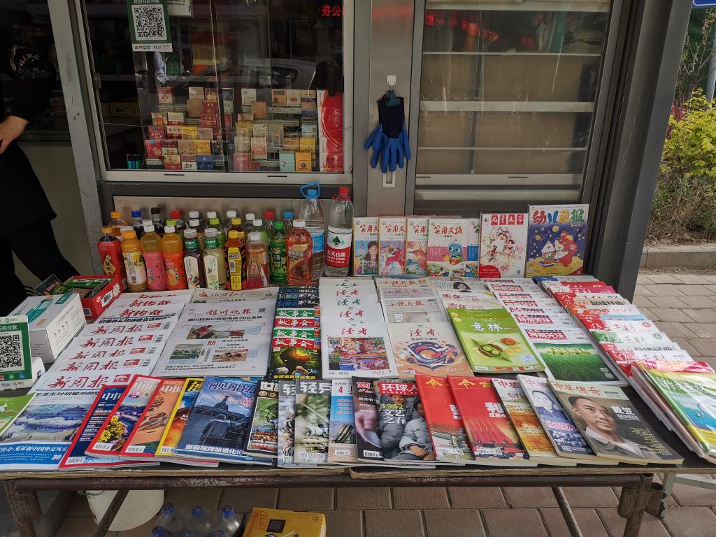 张彦孝经营的报刊亭外简易桌上铺满各种杂志和报纸。新华社记者 许晋豫 摄