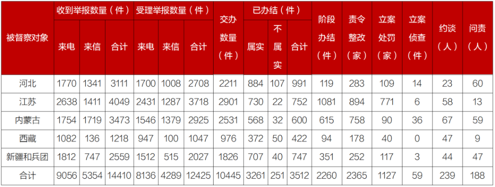 截至22日晚,各督察组共收到群众来电、来信举报14410件,受理有效举报12425件,经梳理合并重复举报,累计向有关省(区)和兵团转办10445件。有关省(区)和兵团已办结或阶段办结5772件。其中,立案处罚1127家,立案侦查59件;约谈党政领导干部239人,问责党政领导干部188人。