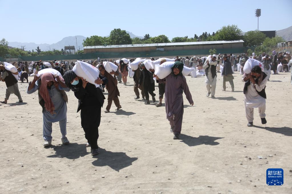 4月23日,阿富汗民众在喀布尔领取中国援助的粮食。新华社发(塞夫拉赫曼·萨菲摄)