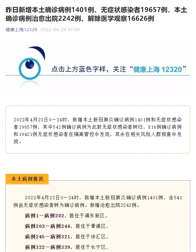 2022年4月23日0—24时,新增本土新冠肺炎确诊病例1401例,含541例由无症状感染者转为确诊病例。新增治愈出院2242例。