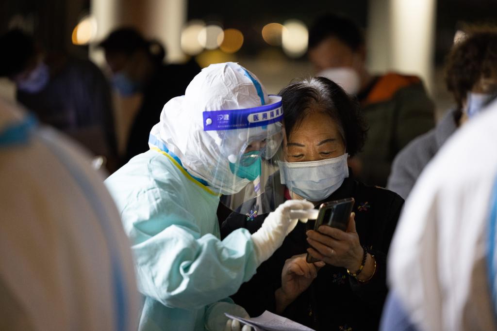 4月23日晚,在上海世博方舱医院,医护人员帮助黄阿婆登记相关信息。新华社记者 金立旺 摄