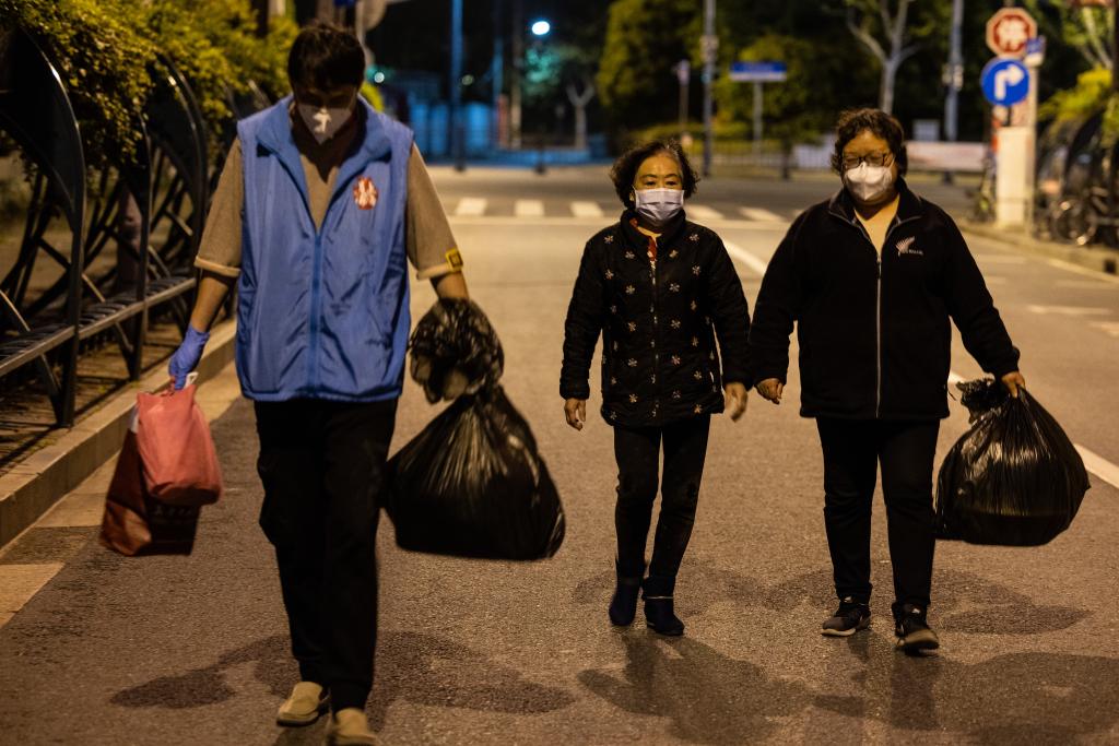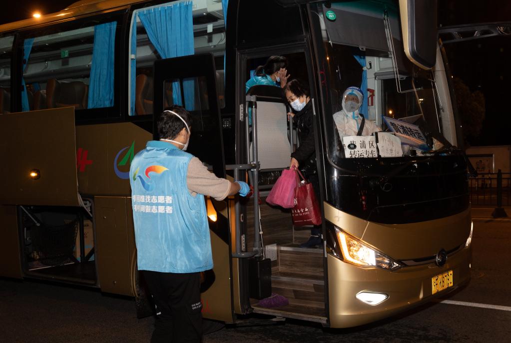 4月23日晚,在广福居民区福佑路和河南南路路口,广福居委会主任张华迎接黄阿婆回家。新华社记者 金立旺 摄