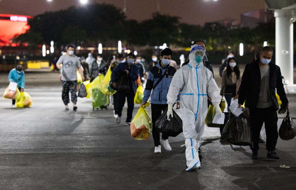 4月23日晚,在上海世博方舱医院,医护人员带领康复者走出方舱医院。新华社记者 金立旺 摄