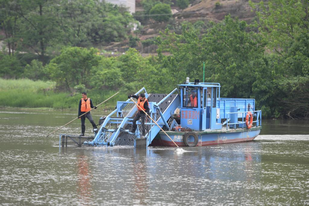 4月14日,工作人员在湖南省醴陵市渌水之上打捞杂草、垃圾等。新华社记者薛宇舸摄