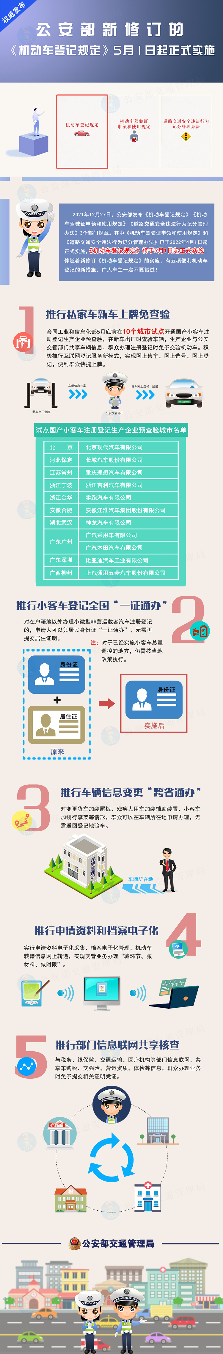 其中,公安部会同工业和信息化部5月底前在10个城市试点开通国产小客车注册登记生产企业预查验,实行新车出厂时查验车辆,生产企业与公安交管部门共享车辆信息,群众办理注册登记时免予交验机动车。积极推行互联网登记服务新模式,实现网上售车、网上选号、网上登记,便利群众快捷上牌,助力汽车行业发展。在试点基础上,全国逐步推行。