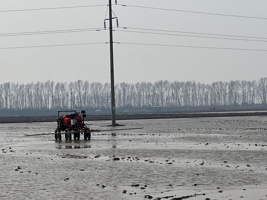 北大荒集团建三江分公司创业农场有限公司的一块水田里,无人驾驶智能搅浆整地机正在作业。(受访者供图)
