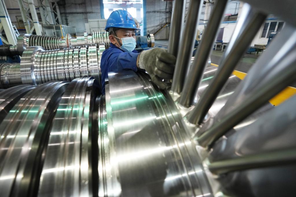 4月15日,在哈电集团哈尔滨汽轮机厂有限责任公司车间,工人在进行生产作业。新华社记者王建威 摄