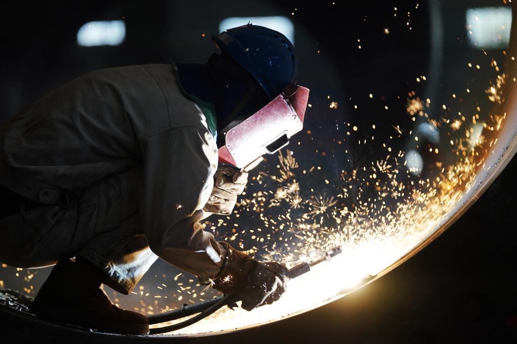 4月14日,在哈电集团哈尔滨锅炉厂有限责任公司车间,工人在进行生产作业。新华社记者王建威 摄