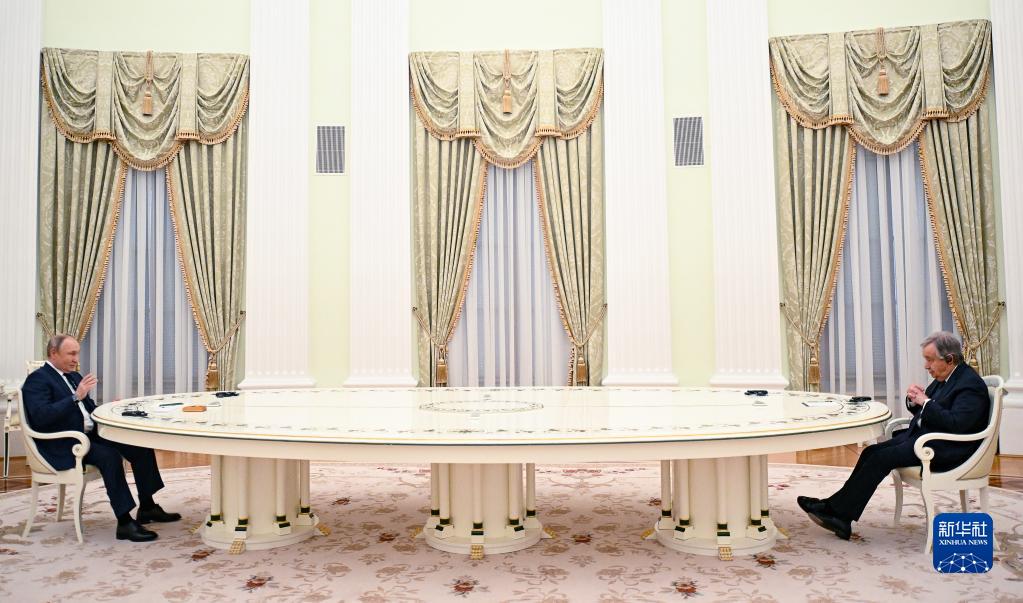 4月26日,俄罗斯总统普京(左)在莫斯科与联合国秘书长古特雷斯举行会谈。新华社/塔斯社