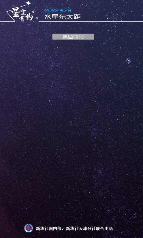 新华社天津4月27日电(记者周润健)4月29日,神秘的水星将打开观赏窗口。天文科普专家介绍,这是今年水星的第三次大距,也是第二次东大距,更是今年观测水星的最佳时机。届时如果天气晴好,我国感兴趣的公众可在当日黄昏时分面向西方低空,借助双筒望远镜或小型天文望远镜寻找水星。如果大气透明度足够好,视力好的人甚至可以用肉眼直接观测到它。