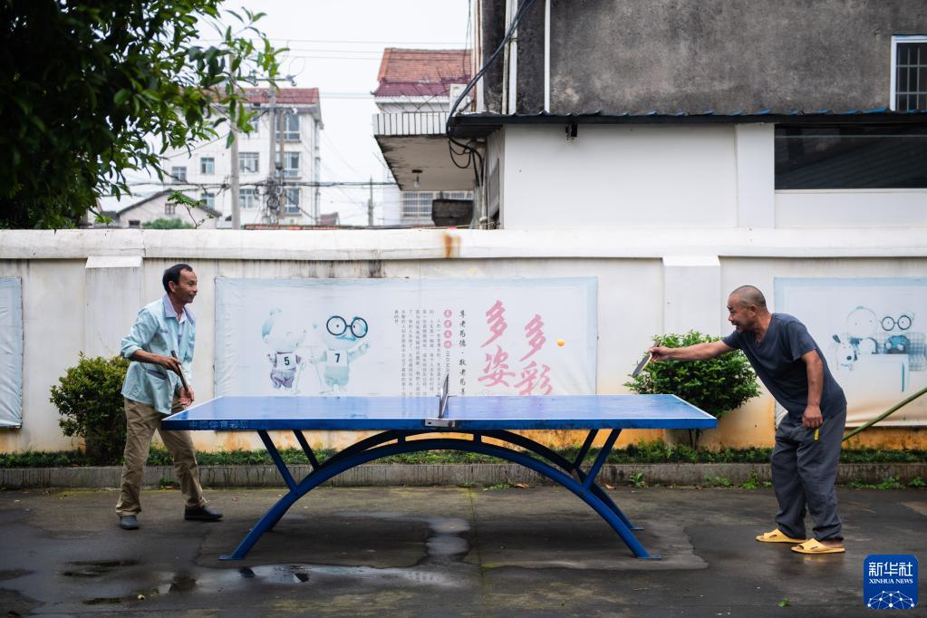 4月27日,在鼎城区郭家铺街道三滴水社区幸福屋前,老人们打乒乓球。
