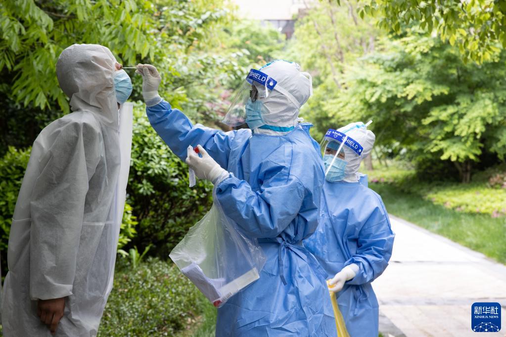 4月26日,在北蔡镇一处封控楼,田鸽(中)在采样。