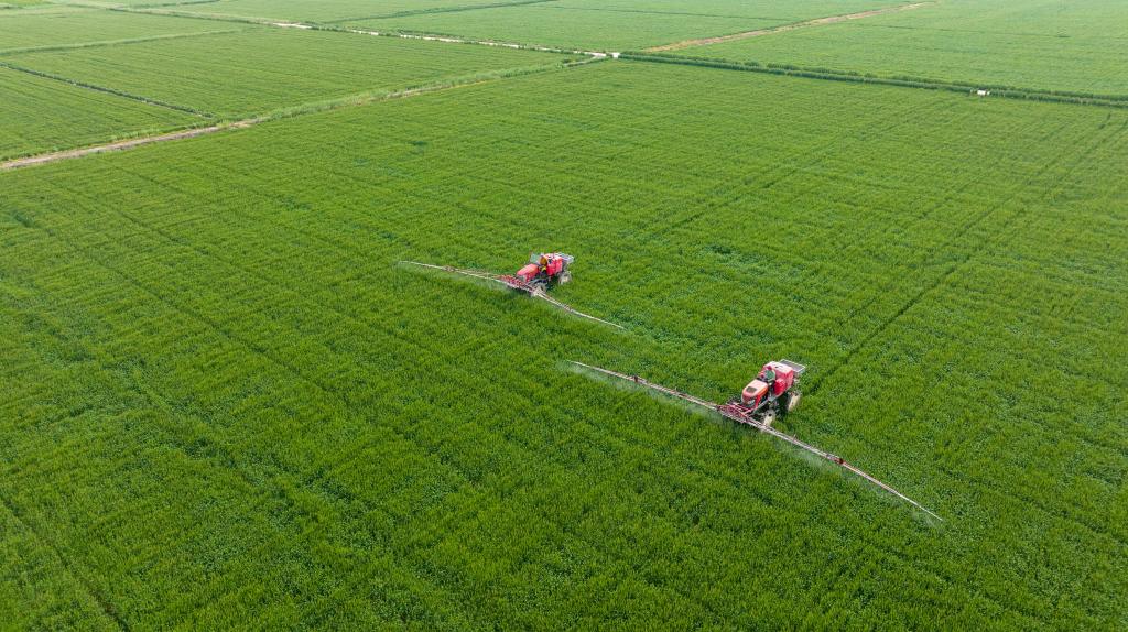 2022年4月20日,江苏省海安市孙庄街道夏岔村一种植基地,村民驾驶植保机械在小麦田间作业(无人机照片)。新华社发(翟慧勇摄)