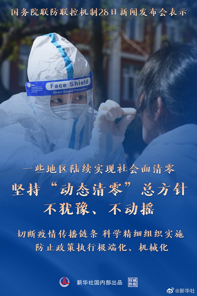 国务院联防联控机制28日新闻发布会表示,当前,我国现有本土确诊病例和正在医学观察的无症状感染者近10天来持续波动下降,一些地区陆续实现社会面清零。要始终坚持“动态清零”总方针不犹豫、不动摇,切断疫情传播链条,科学精细组织实施,防止政策执行极端化、机械化。(记者徐鹏航、温竞华,海报设计:乔昕)
