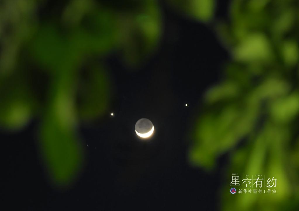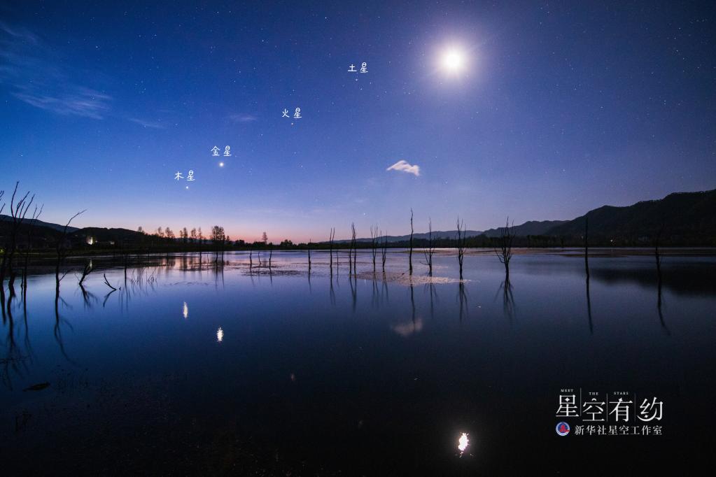 这是重庆市天文爱好者戴建峰2022年4月24日在云南省曲靖市会泽县念湖拍摄的“四星连珠伴月”,其中金星和木星彼时已挨得很近。(本人供图)