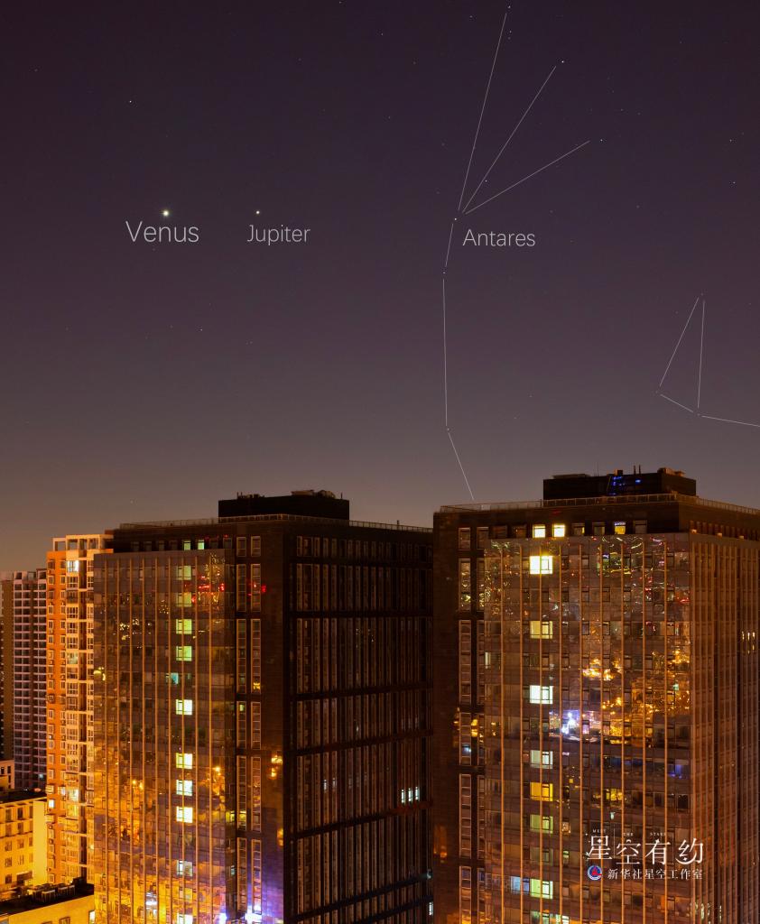 这是北京市天文爱好者孙思2019年1月26日在北京拍摄的金星、木星和心宿二。(本人供图)