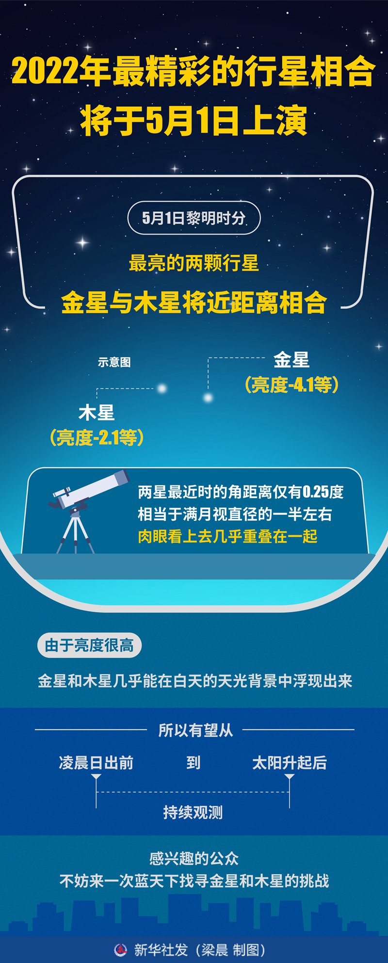 新华社天津4月29日电(记者周润健)5月1日黎明时分,最亮的两颗行星——金星与木星将近距离相合,上演“超亲密一刻”。天文科普专家表示,这是今年最精彩的一次行星相合,也是今年的重磅天象之一。由于这两颗行星都非常明亮,即使是在光污染较为严重的城市,也能用肉眼轻松捕捉到它们的“身影”。