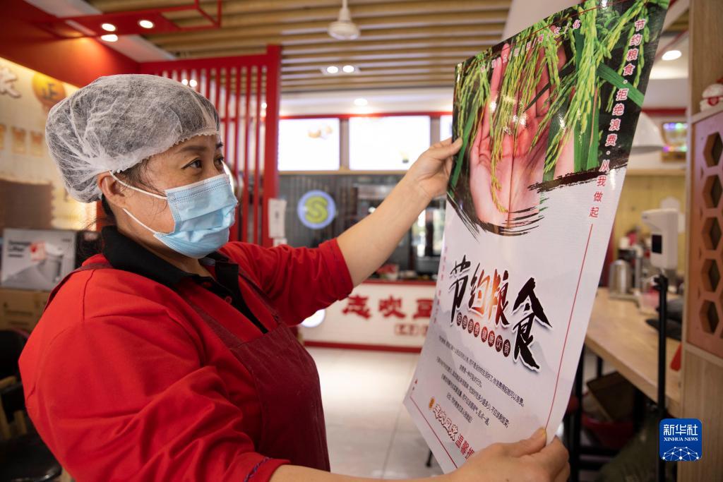 4月28日,在哈尔滨市道里区一家饭店,工作人员准备张贴节约粮食宣传画。新华社记者 张涛 摄
