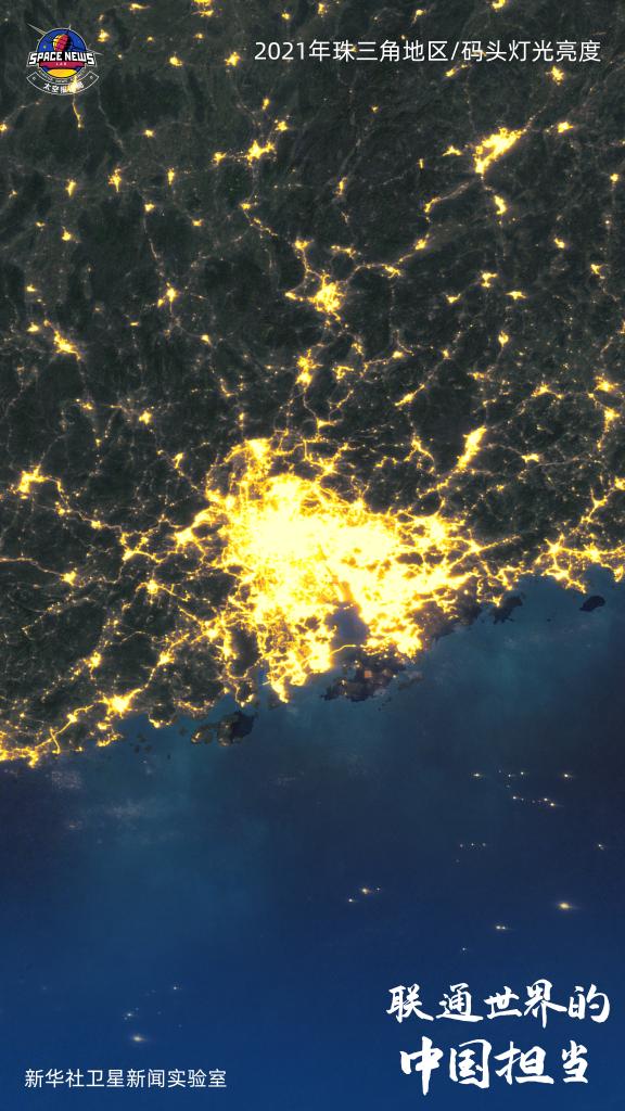 这是2021年珠三角地区的全年夜光图。2021年,在新冠肺炎疫情的冲击下,中国的对外贸易并未停下脚步,中国外贸城市进出口总额排行榜中,珠三角的四座城市——深圳、东莞、广州、佛山——位居外贸城市榜单前十。2021年,珠三角经济达到新里程碑,GDP突破10万亿元。(新华社记者马晓澄)
