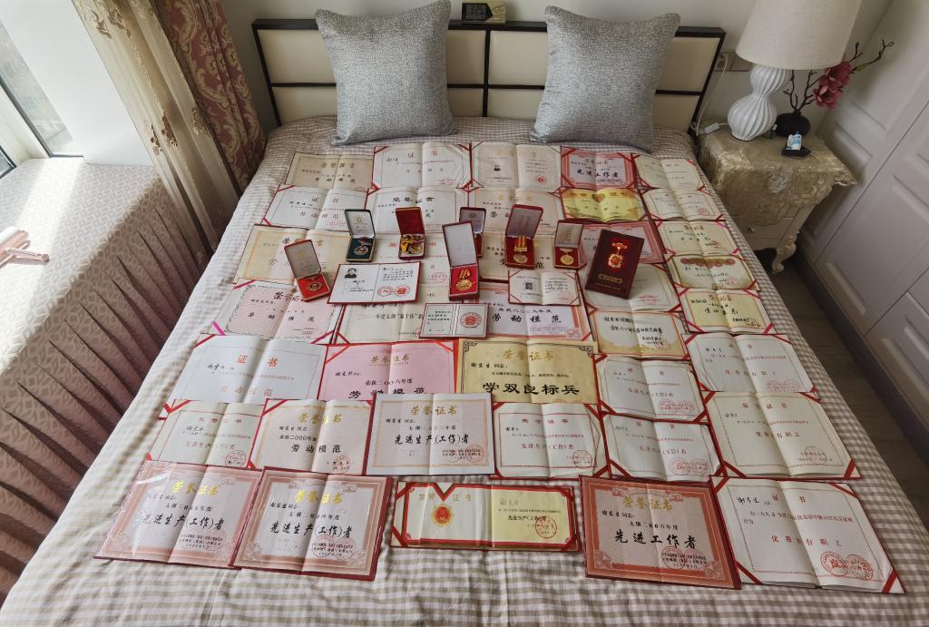 谢东升获得的各项荣誉。(新华社记者马志异 摄)