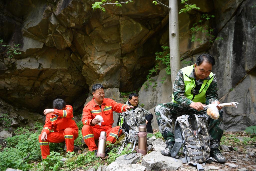 赵苍虎(右一)与同事在山间休息。(新华社记者张博文 摄)