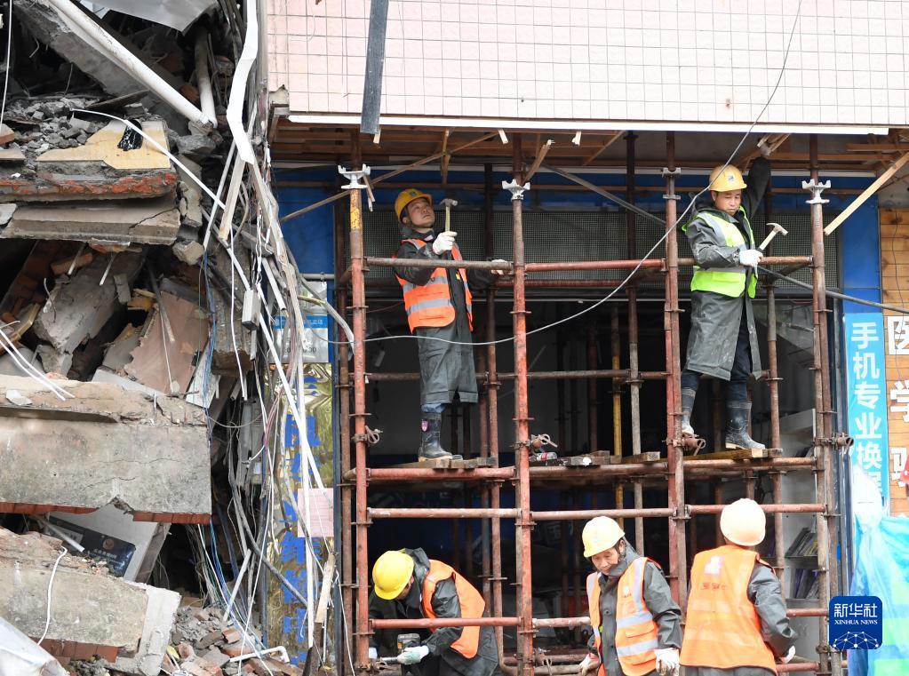 4月30日,救援人员紧急加固东西两侧受损严重、随时可能倒塌的房屋。新华社记者 申宏 摄