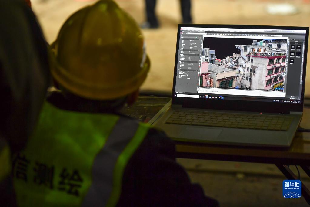 4月30日,救援人员在湖南长沙居民自建房倒塌事故现场对建筑进行测绘监测。新华社记者 陈泽国 摄