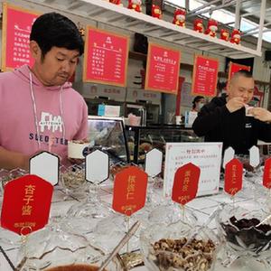 在位于伊宁市六星街景区的古兰丹姆百年手工冰激凌店里,游客在干果、果酱台为冰激凌选择配料(4月14日摄)。新华社发(王志华 摄)