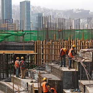 4月27日,在黎巴嫩首都贝鲁特附近的迪巴耶,工人在中国政府援建黎巴嫩国家高等音乐学院项目工地上工作。新华社记者 刘宗亚 摄