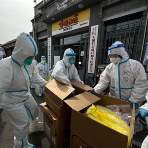 西城区大栅栏街道防疫人员为辖区居民筹备保障物资。西城区大栅栏街道供图