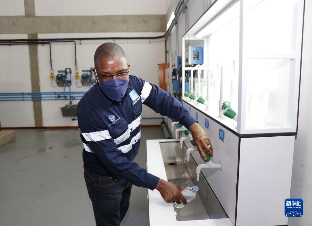 这是4月25日,在博茨瓦纳马哈拉佩,自来水厂升级改造项目经理拜纳德·布朗展示经过处理的自来水。新华社发(策基索·特巴洛摄)