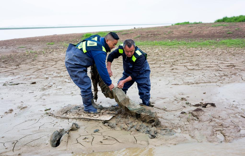 在江西鄱阳湖都昌水域,占柏山(左)和同事正在湖滩清理废弃渔网。