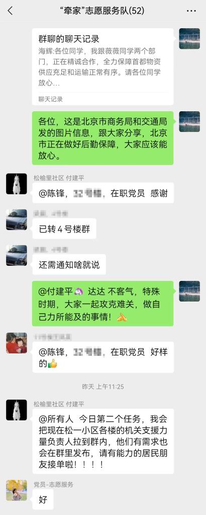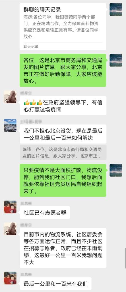 “我们不担心北京没货,现在(问题)是最后一公里和最后一百米如何解决?”很快又有居民提出疑问。陈锋马上进一步留言解释:“只要疫情不是大面积扩散,物流没停,(物资)能到我们社区门口,我想后面就要依靠社区党员居民自我组织起来了。”另外一位党员在群里紧跟着留言:“社区已有志愿者群,最后一公里和一百米有我们!”