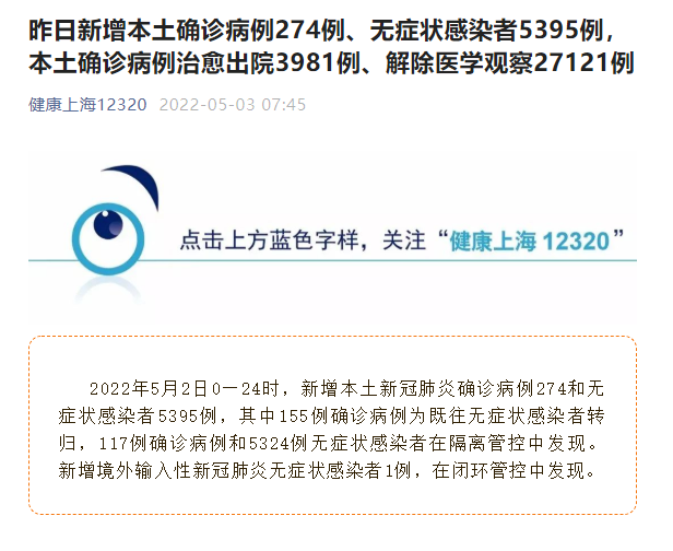 2022年5月2日0—24时,新增本土新冠肺炎确诊病例274例和无症状感染者5395例,其中155例确诊病例为既往无症状感染者转归,117例确诊病例和5324例无症状感染者在隔离管控中发现。新增境外输入性新冠肺炎无症状感染者1例,在闭环管控中发现。