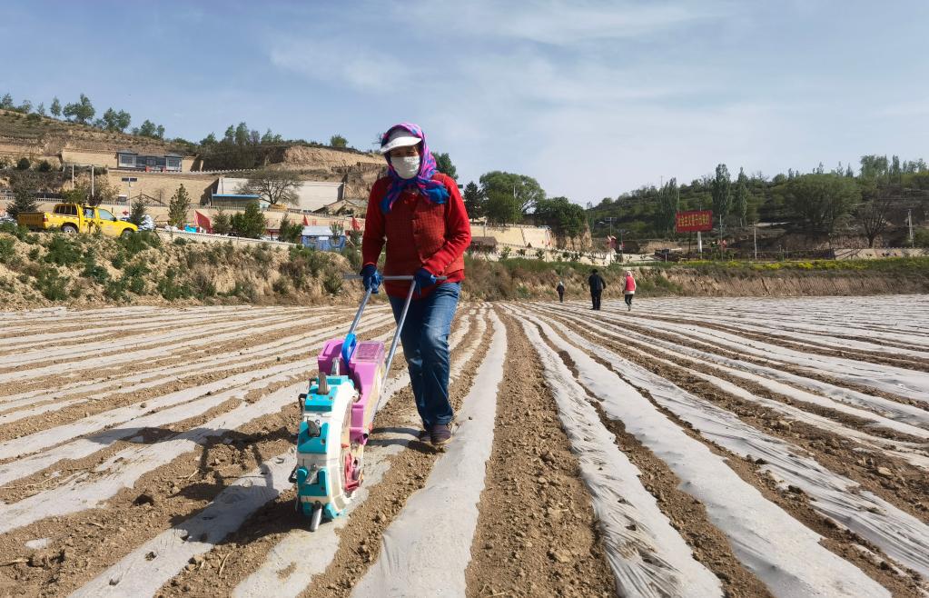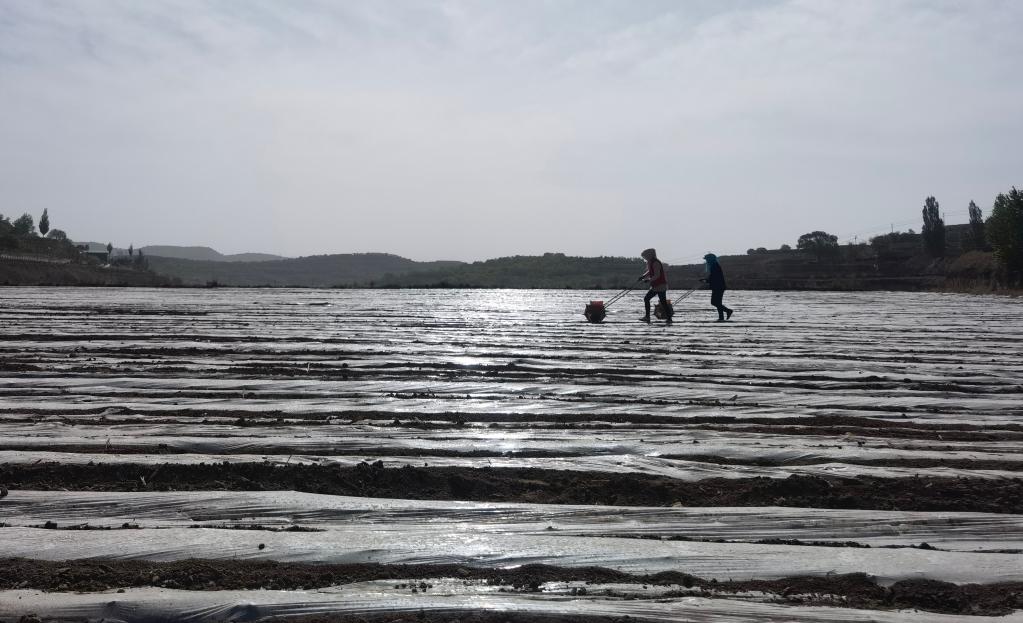农田里,一行行地膜反射着耀眼的光。清晨,村民们三三两两地来到田间开始播种。这里是宁夏固原市彭阳县白阳镇中庄村村集体流转经营的1000亩农田。