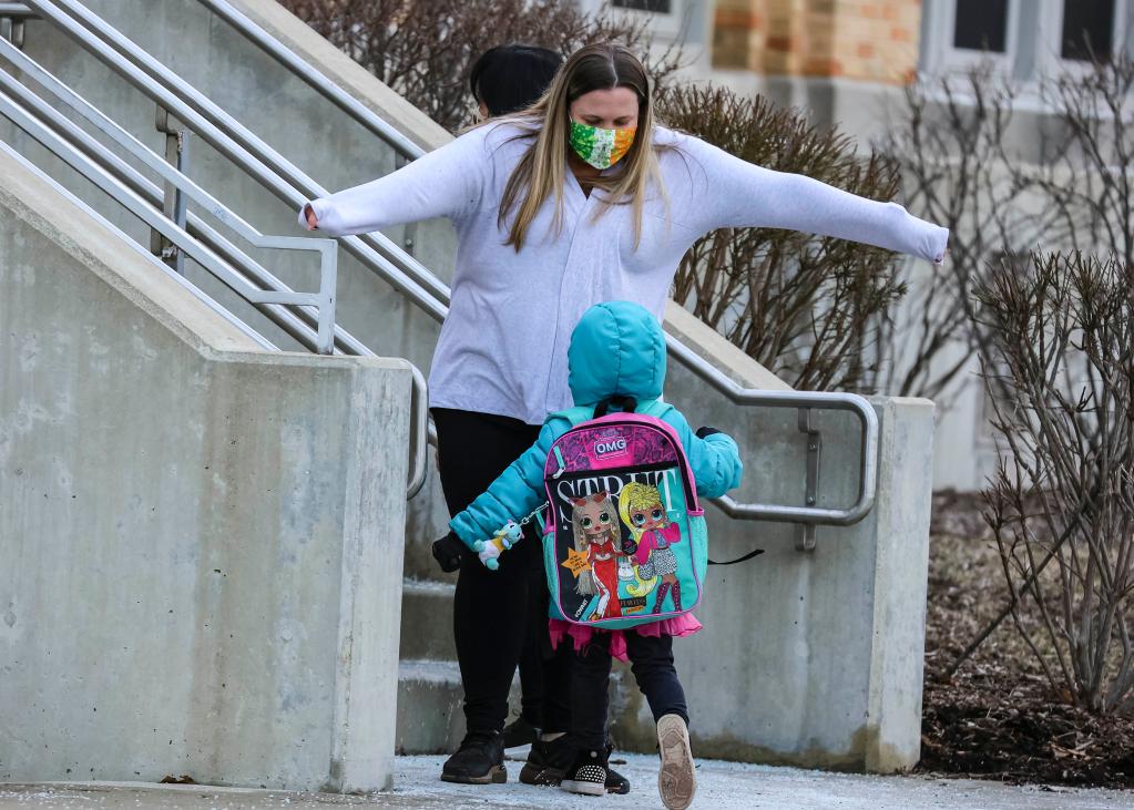 3月14日,在美国芝加哥,教师迎接一名到校上课的学生。当天,美国芝加哥公立学校取消在校必须佩戴口罩的规定。新华社发(乔尔·莱纳摄)