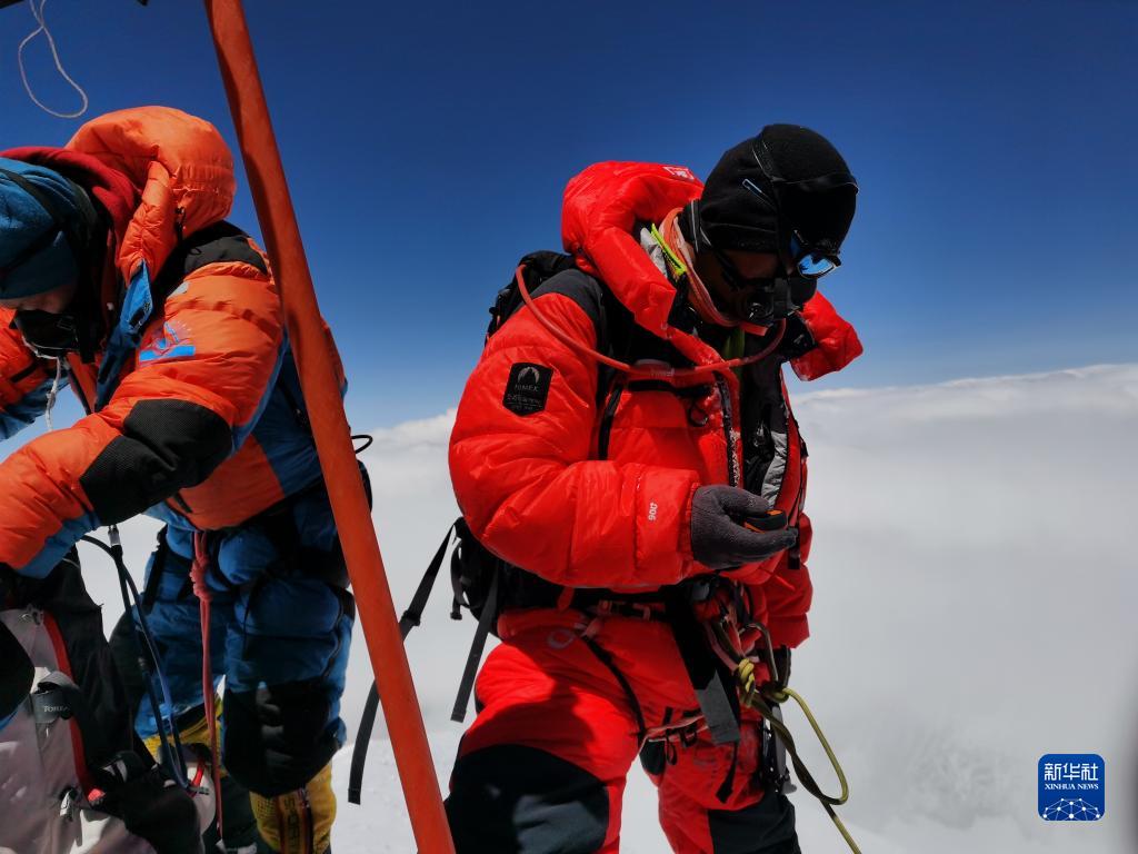 5月4日,科考队员登上珠穆朗玛峰峰顶。新华社特约记者 索朗多吉 摄