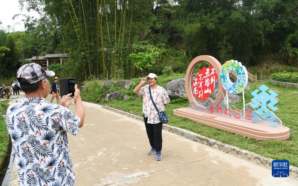 5月4日,游客在海南省五指山市水满乡毛纳村拍照留念。