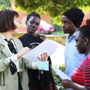 2022年4月19日,在乌干达首都坎帕拉,麦克雷雷大学孔子学院中文教师王梦云(左)与学生进行交流。新华社记者张改萍摄