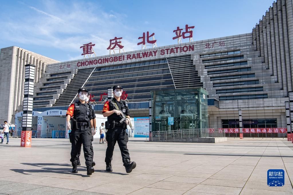 5月4日,张文秀(前左)与同事在重庆北站北广场巡逻。