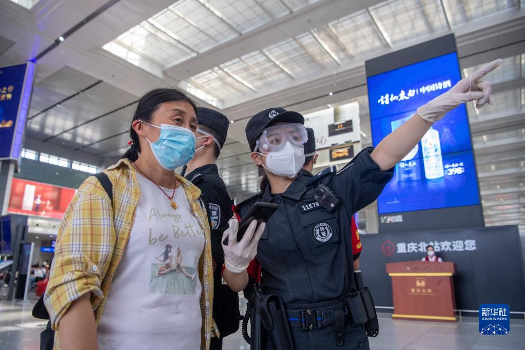 5月4日,张文秀(右)在重庆北站候车厅为旅客指路。