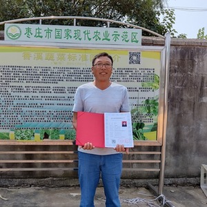 山东枣庄市台儿庄区张庄村香溪蔬菜种植专业合作社理事长徐新华向记者展示自己的农民副高级农艺师职称证书。新华社记者 邵鲁文 摄