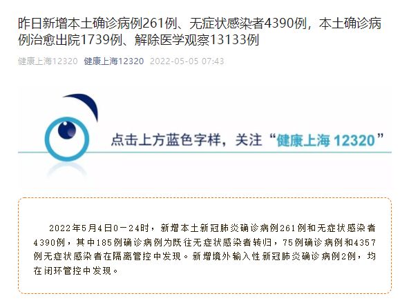 2022年5月4日0—24时,上海新增本土新冠肺炎确诊病例261例和无症状感染者4390例,其中185例确诊病例为既往无症状感染者转归,75例确诊病例和4357例无症状感染者在隔离管控中发现。新增境外输入性新冠肺炎确诊病例2例,均在闭环管控中发现。