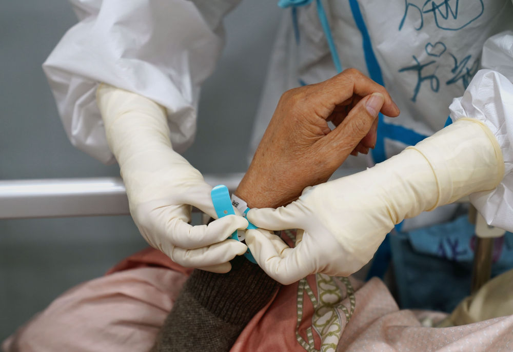 ↑4月23日,上海临港方舱医院的医护人员帮助老年患者佩戴腕带。